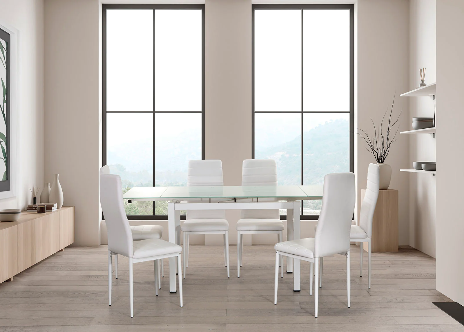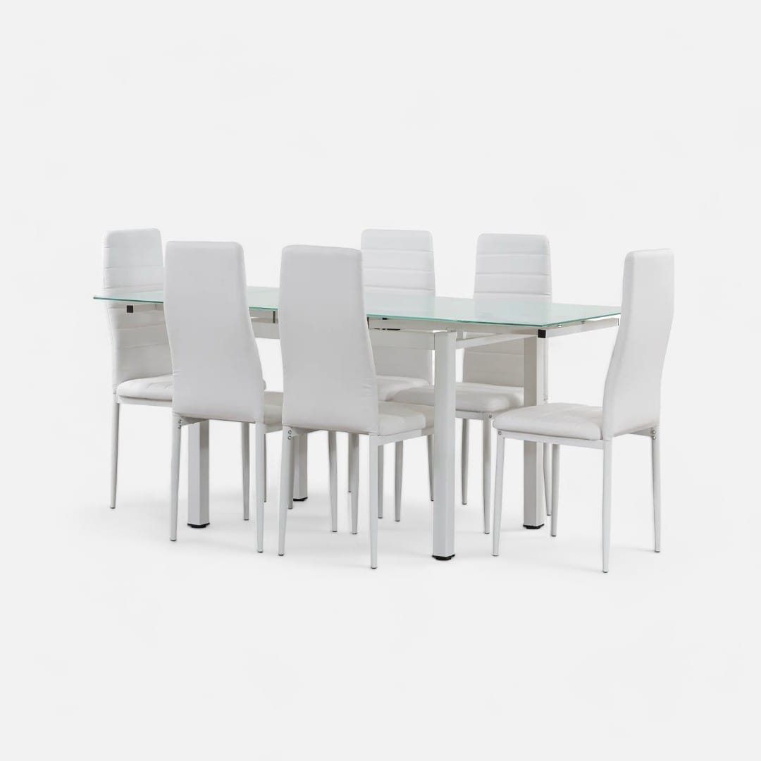 Immaculate White White evokes a sense of freshness and purity, bringing an air of elegance to any space. Our white dining set features an extendable glass table paired with white faux leather chairs, creating a bright and inviting atmosphere in your home. Enjoy the versatility and timeless beauty of white with this classic option.