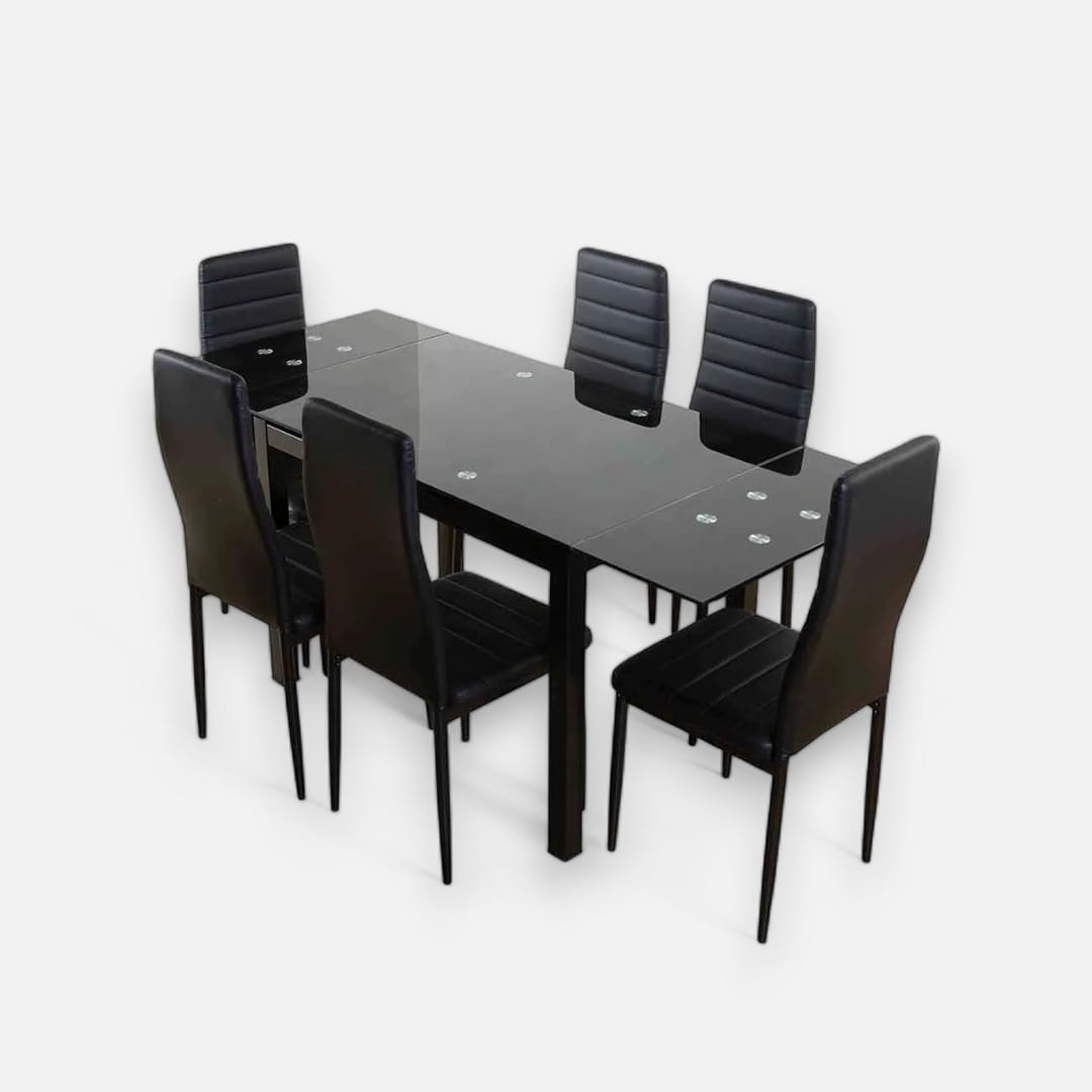 Sophisticated Black Black is synonymous with elegance and contemporary style. Our black dining set offers an extendable glass table combined with black faux leather chairs, making a bold statement in your dining space. This dark and sophisticated tone adds a touch of drama and modernity, turning every meal into an elegant experience.